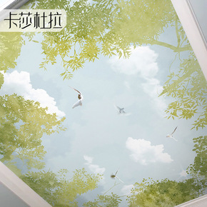 田园天空云朵天花板墙纸清新绿色卧室客厅背景墙壁纸吊...