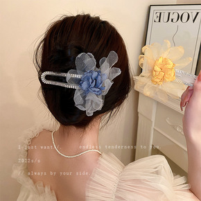 韩国气质镶钻网纱花朵发夹小众百搭后脑勺盘发鸭嘴夹简...