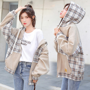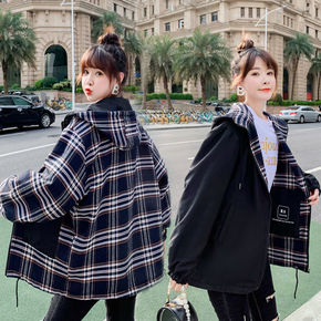 格子外套少女春秋装初中高中学生韩版宽松拼色连帽工装...