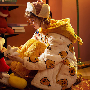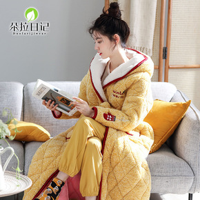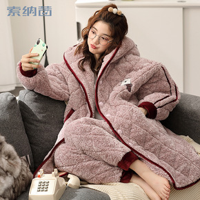 冬季贝贝绒夹棉睡衣女三层加厚带帽法兰绒中长款加大码...