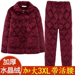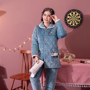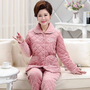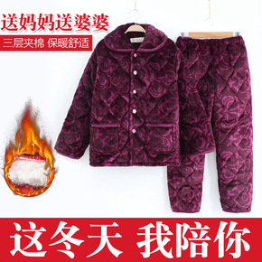 中年女士睡衣秋冬加厚牛奶绒三层加厚夹棉加大码妈妈棉...