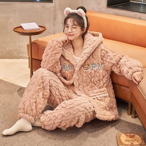 睡衣女士三层夹棉加厚女珊瑚绒法兰绒秋冬保暖可爱家居...