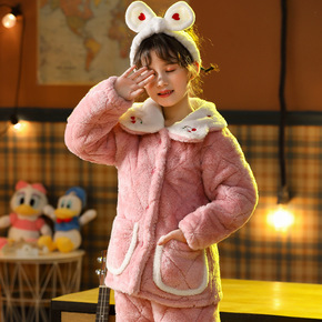 秋冬季儿童睡衣法兰绒女孩三层夹棉中大童家居服女童珊...