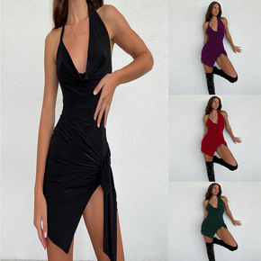 2022亚马逊春夏跨境新款欧美女装挂脖镂空绑带开叉...