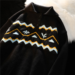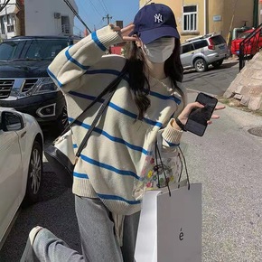 跨境新款2022美式高街毛衣女复古软糯条纹翻领上衣...