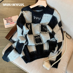 软奶蓝复古套头吃土毛衣女秋冬法式慵懒风宽松格子森系...