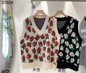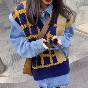 拼色格子v领针织马甲女21秋冬新款洋气叠穿毛衣宽松...
