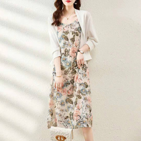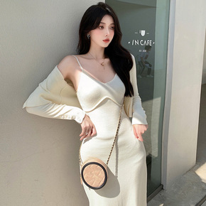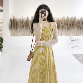 新款吊带格子连衣裙+冰丝针织防晒衣开衫两件套装分开...