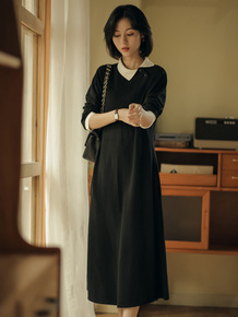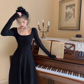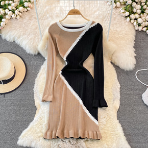 圆领针织连衣裙秋冬长袖女法式撞色复古收腰显瘦气质包...
