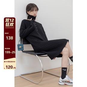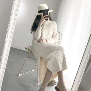 白色宽松慵懒风中长款高领套头针织麻花毛衣裙过膝开叉...