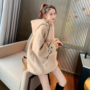 仿羊羔绒卫衣裙胖MM秋冬韩版长袖连帽印花上衣宽松大...