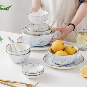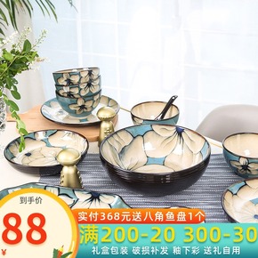 日式和风雪花釉手绘陶瓷碗碟套装盘子家用餐具饭碗汤碗...