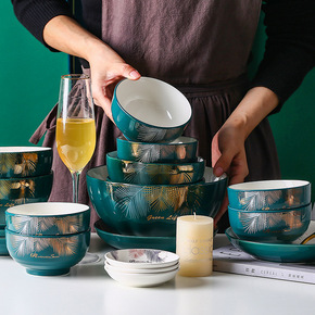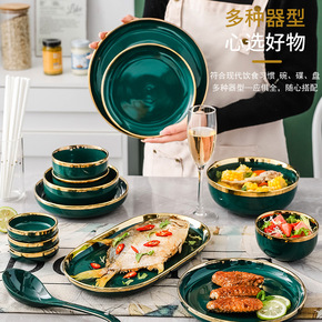 北欧轻奢风金边祖母绿色餐具套装多人家用米饭碗盘子陶...