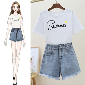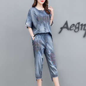 牛仔套装女夏2021新款大码宽松短袖洋气复古刺绣休...