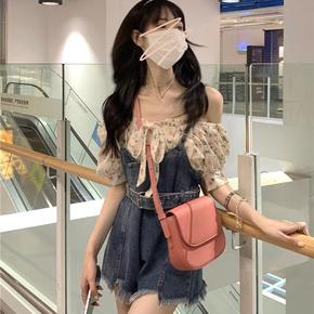 两单件套装腿修炼碎花一字肩雪纺衬衫+高腰显瘦毛边不...