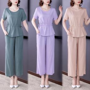 纯色棉绸套装女时尚外穿夏抽绳收腰妈妈中年洋气减龄九...