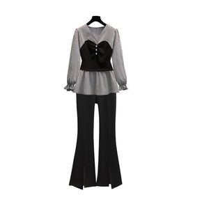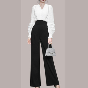 2021秋装新款女装v领宽松长袖上衣+高腰直筒休闲...