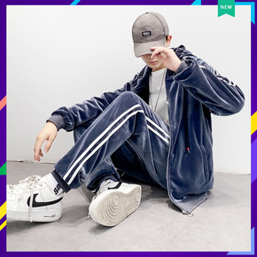 2021秋冬季金丝加绒加厚保暖运动套装两件套男士学...