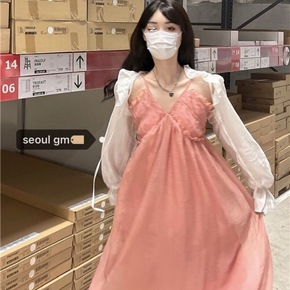 单件套装风look~甜美V领粉色初恋裙长款雪纺连衣...