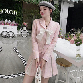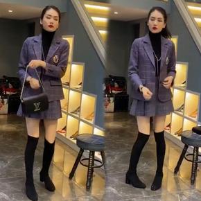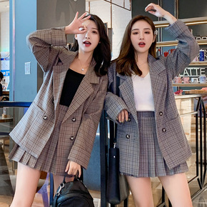时尚套装女2020秋冬气质显瘦格子小西服外套百褶裙...