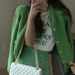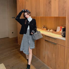 秋装搭配气质轻熟风御姐针织开衫高腰千鸟格不规则套装...