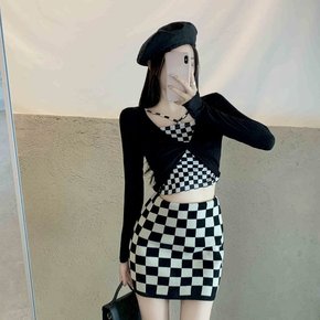 个性假两件短款长袖t恤上衣+棋盘格包臀裙半身裙时尚...