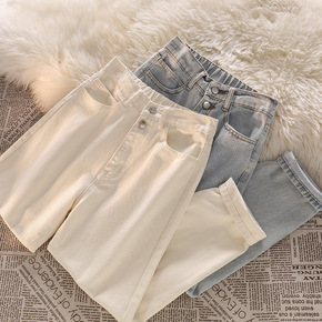 象牙白复古牛仔裤女高腰显瘦小脚直筒女式牛仔裤...