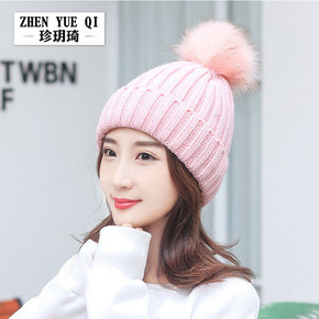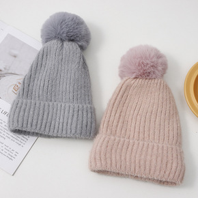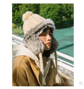 韩版秋冬季帽子简约大毛球针织帽女士户外加绒护耳毛线...