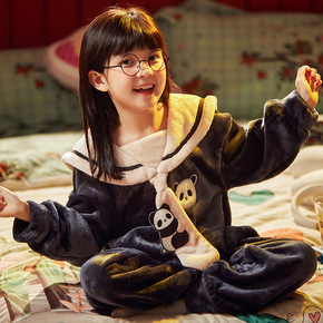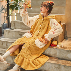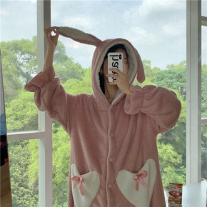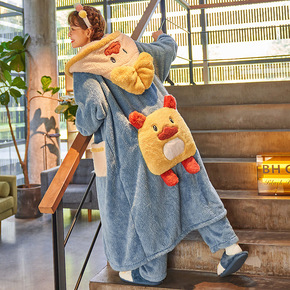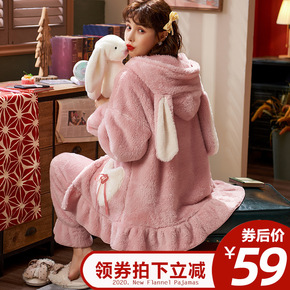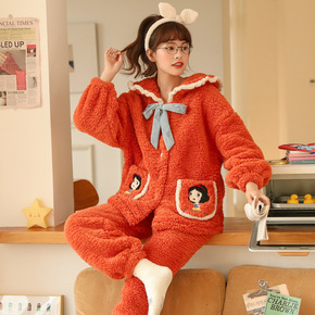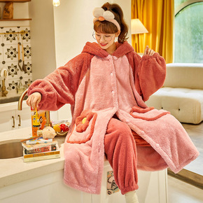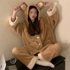 包邮珊瑚绒睡衣女秋冬季加厚加绒风可爱连帽少女可外穿...
