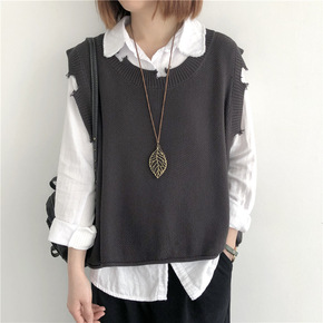 2119#春秋宽松连帽针织开衫马甲女拼色短款马夹外...