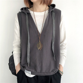 363#马甲女春秋短款宽松大码坎肩连帽V领背心套头...
