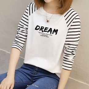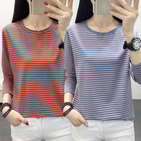 纯棉新款秋装大码长袖t恤女圆领条纹宽松胖mm外穿百...