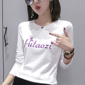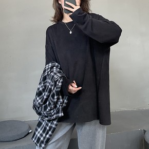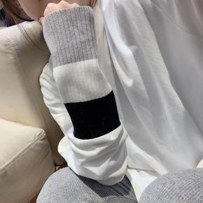 加绒加厚白色T恤女2020秋冬针织袖拼接袖百搭遮臀...