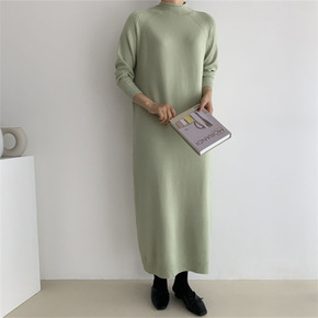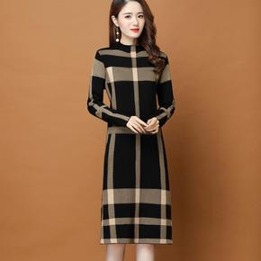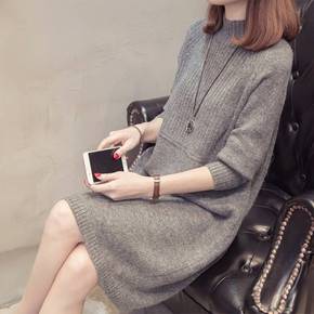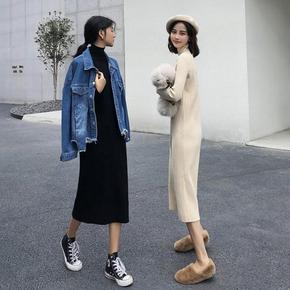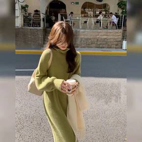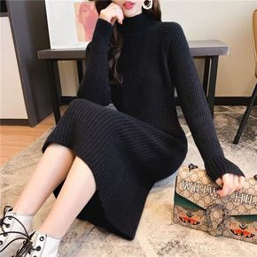 连衣裙女中长款秋冬加厚保暖毛衣半高领针织衫韩版新款...