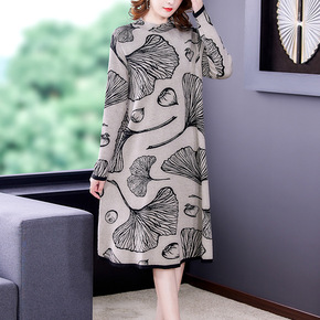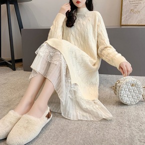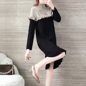 针织连衣裙女2021秋冬新款时尚洋气半高领宽松遮肚...