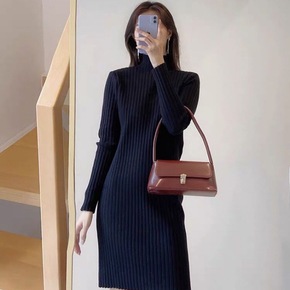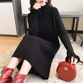 针织连衣裙女中长款毛衣女外穿秋冬加厚半高领打底衫连...