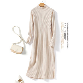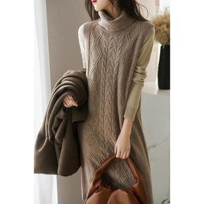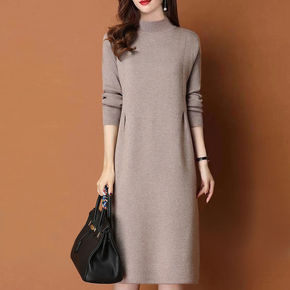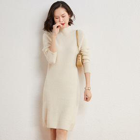 半高领羊绒裙连衣裙女秋冬中长裙宽松显瘦毛衣裙过膝针...