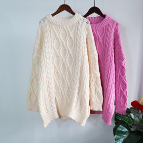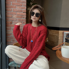 蓝色复古麻花针织衫女冬季新款女装宽松慵懒外穿毛衣厚...