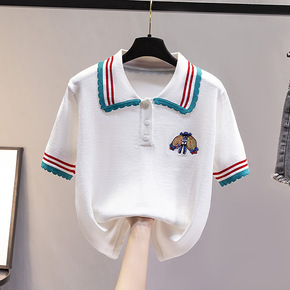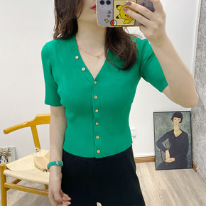2022春夏新款女装镂空针织衫T恤宽松薄款冰丝v领...