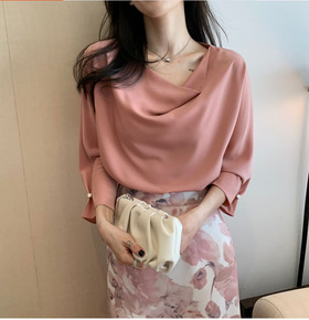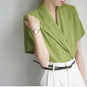 纯色衬衫女设计感上衣小众小个子短袖天丝衬衣职业工作...