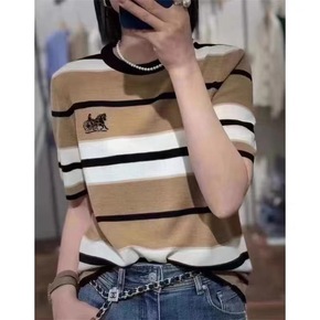 正肩复古条纹t恤女夏季2022新款韩版宽松设计感圆...