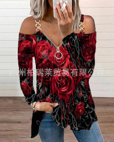 2021亚马逊欧美秋冬玫瑰花拉链套头长袖印花宽松型...