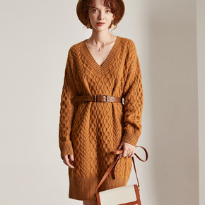 2021早春新款通勤毛衣宽松加厚重工提花中长针织开...