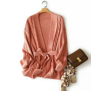 卡莎娜秋冬羊毛衫V领开衫中长款宽松麻花纯羊毛针织毛...