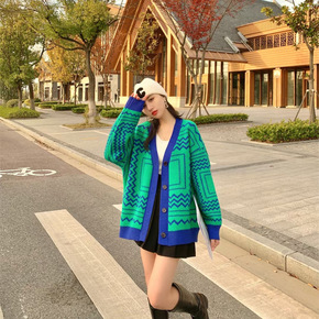欧洲站回字波纹拼色毛衣外套女2021秋冬新款宽松慵...