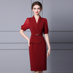 甜美法式红色连衣裙女五分袖2022春季新款收腰显瘦...