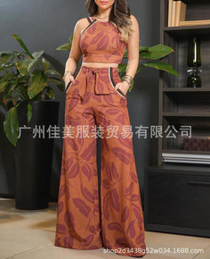 2021跨境新款女装时尚纯色抽绳短袖上衣阔腿开叉长...