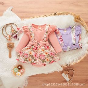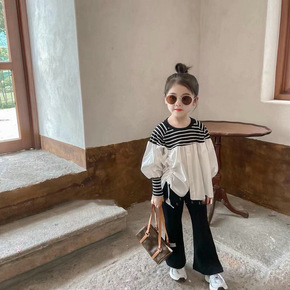 女童秋天哈裙套装 外贸童装坑条飞袖假两件吊带裙哈衣...