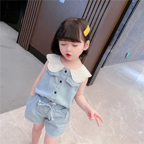 外贸女童花边领牛仔套装2022夏季新款韩版洋气两件...