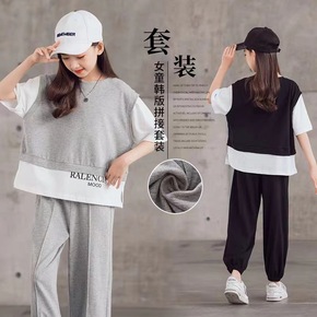 儿童夏季套装中大童洋气运动假两件上衣网红女童夏季短...